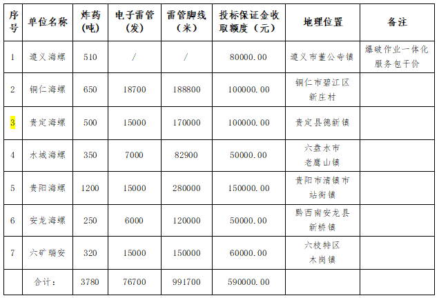 投標(biāo)人在報(bào)價(jià)時(shí)應(yīng)綜合考慮炸藥以及電子雷管的使用量、運(yùn)輸、人工成本以及爆破作業(yè)中一切不確定因素,具體詳見報(bào)價(jià)表,結(jié)合備注信息合理報(bào)價(jià)。投標(biāo)人在報(bào)價(jià)時(shí)應(yīng)綜合考慮炸藥以及電子雷管的使用量、運(yùn)輸、人工成本以及爆破作業(yè)中一切不確定因素,具體詳見報(bào)價(jià)表,結(jié)合備注信息合理報(bào)價(jià)。根據(jù)國家法律法規(guī)規(guī)定,同一家單位不能同時(shí)做外委爆破、安全監(jiān)理和安全評(píng)估,若一家單位同時(shí)參與三個(gè)標(biāo)段投標(biāo),則優(yōu)先考慮外委爆破標(biāo)段,其次是安全監(jiān)理標(biāo)段,最后是安全評(píng)估標(biāo)段。