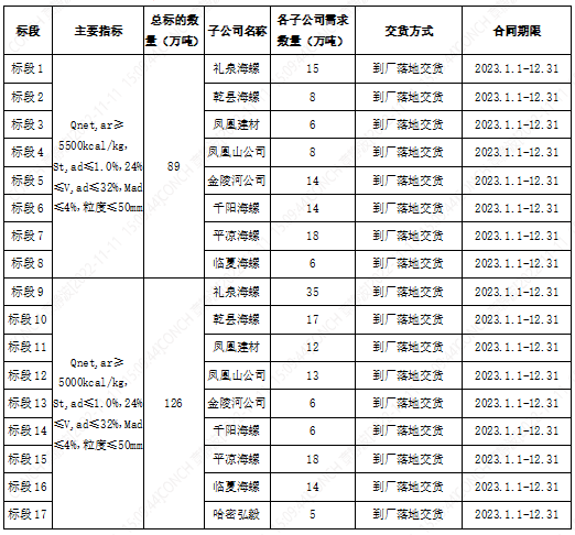 根據(jù)2023年陜甘區(qū)域各子公司煤炭需求,為保障各公司生產(chǎn),擬對(duì)2023年煤炭采購(gòu)進(jìn)行公開(kāi)招標(biāo),現(xiàn)將招標(biāo)相關(guān)事宜公告如下: