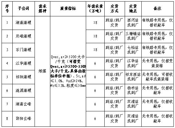 根據(jù)2023年海螺水泥湖南區(qū)域相關(guān)子公司:湖南海螺水泥有限公司(以下,簡稱“湖南海螺”)、雙峰海螺水泥有限公司(以下,簡稱“雙峰海螺”)、石門海螺水泥有限責任公司(以下,簡稱“石門海螺”)、江華海螺水泥有限責任公司(以下,簡稱“江華海螺”)、祁陽海螺水泥有限責任公司(以下,簡稱“祁陽海螺”)、漣源海螺水泥有限責任公司(以下,簡稱“漣源海螺”)、湖南省云峰水泥有限公司(以下,簡稱“湖南云峰”)、邵陽市云峰新能源科技有限公司(以下,簡稱“邵陽云峰”)8家子公司的非統(tǒng)購直供煤炭采購需求,擬組織湖南區(qū)域2023年非統(tǒng)購煤炭直供渠道準入網(wǎng)上公開招標,選定中標人。本次招標由區(qū)域物資采購中心牽頭,湖南海螺組織,為拓寬采購渠道,同時體現(xiàn)公平、公正、公開原則,現(xiàn)將招標相關(guān)事宜公告如下: