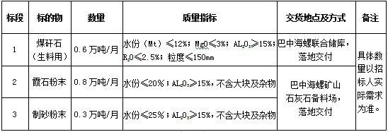 1.標(biāo)的內(nèi)容:煤矸石(生料工序用)、霞石粉末、制砂粉末。