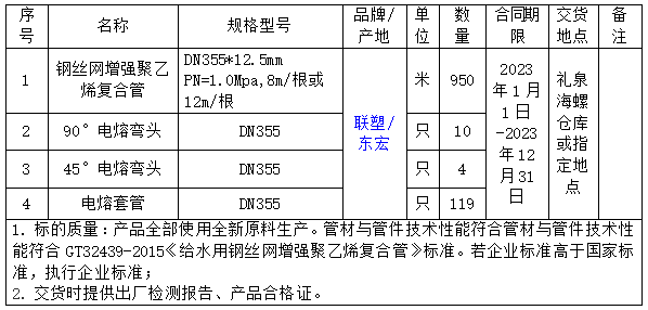 為進(jìn)一步優(yōu)化拓展供應(yīng)渠道,降低采購成本,規(guī)范采購行為,提高采購效率,本著公開、公平、公正、透明的原則,擬開展鋼絲網(wǎng)增強聚乙烯復(fù)合管及配件招標(biāo)采購工作,擇優(yōu)選擇供應(yīng)商,現(xiàn)將招標(biāo)基本信息發(fā)布如下: