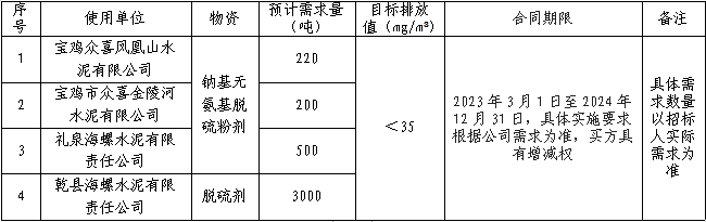 根據(jù)陜甘區(qū)域鳳凰山公司、金陵河公司、禮泉海螺、乾縣海螺等四家公司脫硫劑需求,現(xiàn)擬開展公開招標,為進一步體現(xiàn)公平、公正、公開的原則,拓寬采購渠道,提高采購質(zhì)量,現(xiàn)將招標相關信息公告如下: