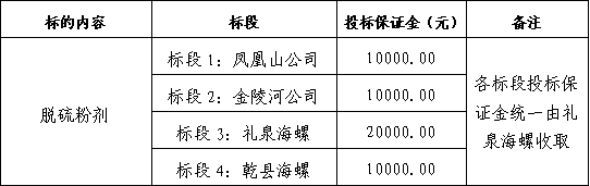 本次招標為鳳凰山公司、金陵河公司、禮泉海螺、乾縣海螺聯(lián)合招標,分為四個標段,若投標人只投一個標段(鳳凰山公司標段、金陵河公司標段、禮泉海螺標段、乾縣海螺標段),則僅需繳納其中一個標段的投標保證金即可,但匯款需注明具體投標的標段。