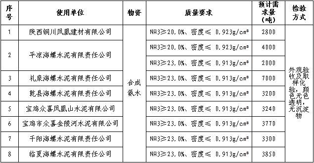 根據(jù)陜甘區(qū)域8家水泥企業(yè)生產(chǎn)經(jīng)營(yíng)計(jì)劃,擬對(duì)2023年度區(qū)域8家公司工業(yè)氨水進(jìn)行公開(kāi)聯(lián)合招標(biāo),為進(jìn)一步體現(xiàn)“公平、公正、公開(kāi)”的原則,此次招標(biāo)在安徽海螺水泥股份有限公司海螺陽(yáng)光智慧采購(gòu)平臺(tái)公開(kāi)進(jìn)行?,F(xiàn)將招標(biāo)采購(gòu)信息發(fā)布如下: