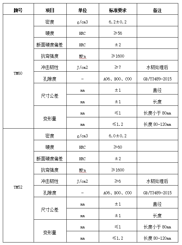 其他要求:硬質(zhì)合金材料不得有因欠燒、過燒導(dǎo)致的外觀、內(nèi)部缺陷;硬質(zhì)合金材料生產(chǎn)用燒結(jié)設(shè)備需要密封良好,不得有因泄漏導(dǎo)致的外表氧化過度;硬質(zhì)合金材料要求無磁性;硬質(zhì)合金材料燒結(jié)時(shí)需盡可能減少鎂砂等耐火材料的粘連,避免因粘連導(dǎo)致的尺寸超差;硬質(zhì)合金材料在澆注鋼水溫度小于1500℃時(shí),不得出現(xiàn)變形、斷裂、漂浮問題。若出現(xiàn)以上問題,損失由供應(yīng)廠家承擔(dān)。