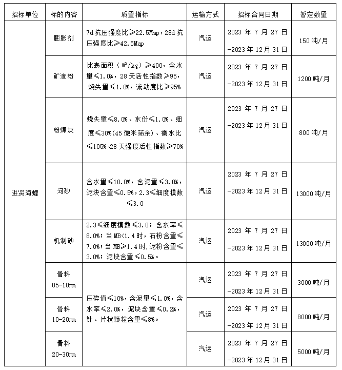 1、標(biāo)的內(nèi)容:膨脹劑、礦渣粉、粉煤灰(二級(jí)灰)、河砂、機(jī)制砂、骨料。