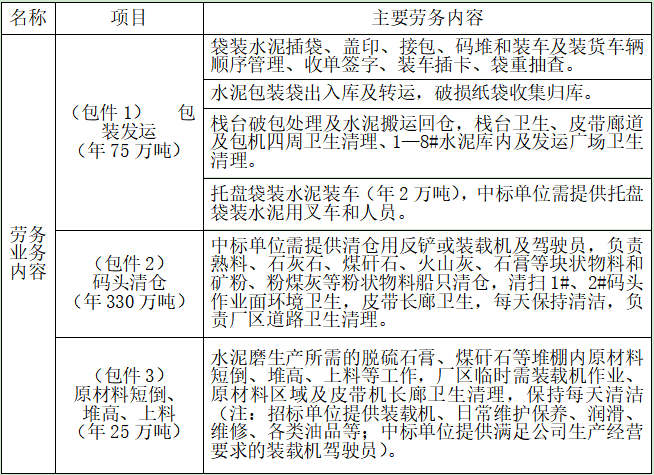 以上包件勞務(wù)合同期限為1年(自勞務(wù)合同簽訂之日起計(jì)算),招標(biāo)人年水泥包裝量約75萬噸,年碼頭清倉量約330萬噸、年原材料短倒上料量約25萬噸,具體以實(shí)際發(fā)生數(shù)量為準(zhǔn)。