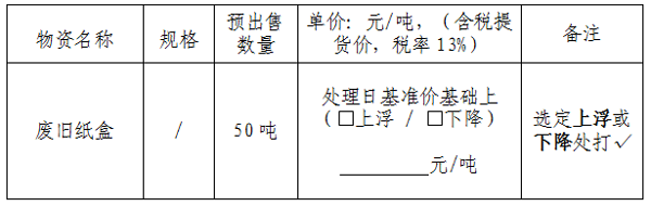 2、對于本次廢紙盒投標價格采用卓創(chuàng)資訊網(wǎng)(https://index.sci99.com)廢紙價格指數(shù)報價,出售價格為出售當日(以車輛重車過磅時間為準)卓創(chuàng)資訊網(wǎng)廢紙價格指數(shù)±xx元/噸。若處理當日指數(shù)停發(fā),以停發(fā)前一日發(fā)布的指數(shù)為準。