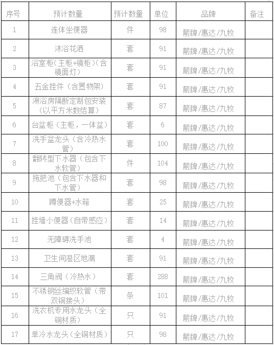 1.標(biāo)的內(nèi)容:衛(wèi)浴材料,具體名稱(chēng)、規(guī)格及數(shù)量等以招標(biāo)文件清單約定為準(zhǔn),產(chǎn)品質(zhì)量需達(dá)到投標(biāo)品牌對(duì)應(yīng)質(zhì)保要求,施工結(jié)束有剩余,若包裝完好不影響二次銷(xiāo)售的需接受退貨。