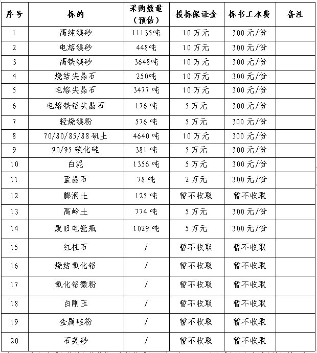 4、上述88礬土、97碳化硅、紅柱石、燒結(jié)氧化鋁、白剛玉、金屬硅粉和石英砂等招標(biāo)采購原材料,因采購量不確定,本次招標(biāo)僅作為本公司采購備用原材料??紤]上述原材料存在無執(zhí)行情況,投標(biāo)保證金、標(biāo)書工本費(fèi)和合同履約保證金暫不收取。
