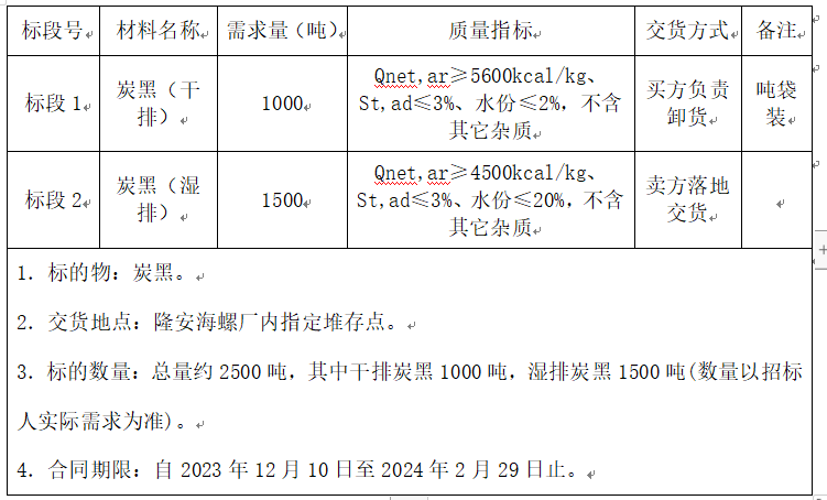 根據(jù)隆安海螺水泥有限責(zé)任公司生產(chǎn)需求,擬對(duì)生產(chǎn)用炭黑進(jìn)行招標(biāo)采購(gòu),為體現(xiàn)公平、公正、公開(kāi)的原則,通過(guò)網(wǎng)上海螺陽(yáng)光智慧采購(gòu)平臺(tái)(網(wǎng)址:http://srm.chinaconch.com/)進(jìn)行公開(kāi)招標(biāo),現(xiàn)將招標(biāo)相關(guān)事宜公告如下: