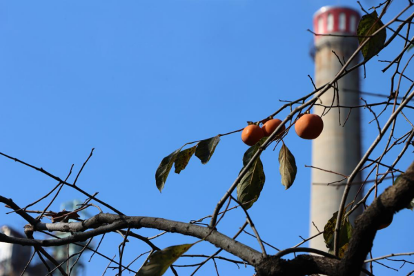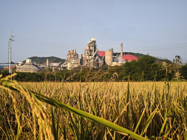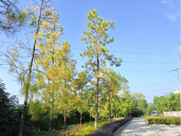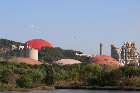 秋高氣爽,白鴿翱翔,紅色廠區(qū)與綠樹(shù)相映成趣