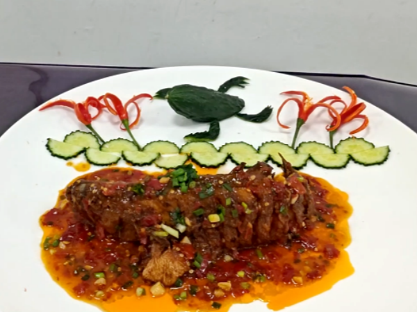 使用食材:鱸魚、番茄醬、胡蘿卜、黃瓜、紅辣椒