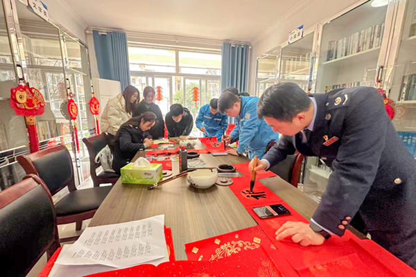 活動(dòng)現(xiàn)場(chǎng),墨香四溢,紅紙翻飛。來(lái)自書法協(xié)會(huì)的書法家們與稅務(wù)局的書法愛(ài)好者們齊聚一堂,揮毫潑墨,一展書法技藝。不一會(huì)兒,一幅幅精心創(chuàng)作又寓意吉祥、飽含祝福的春聯(lián)便鋪滿了桌面。“歲歲常歡愉,年年皆勝意”“生活自在心澎湃,萬(wàn)物可愛(ài)多期待”“盛世和諧添錦繡,新春如意滿吉祥”。一幅幅對(duì)仗工整、字體優(yōu)美的春聯(lián)躍然紙上,不僅為即將到來(lái)的春節(jié)增添了濃濃的喜慶氛圍,也傳遞著對(duì)美好生活的向往和祝福。
