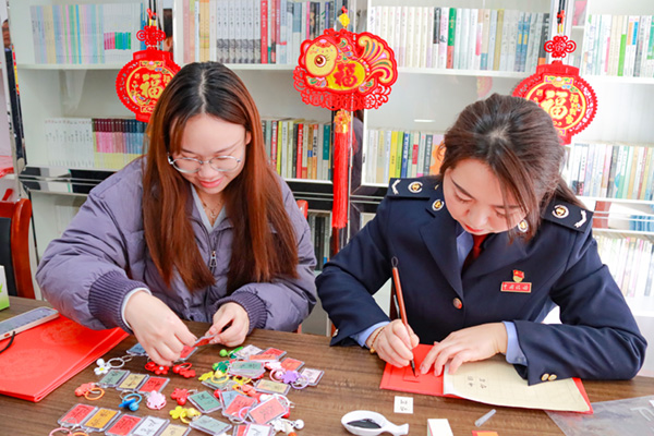 更有擅長(zhǎng)小楷字體的書法高手,專注于書寫精致小掛件。這些小掛件采用質(zhì)地精良的宣紙制作,長(zhǎng)寬不過(guò)數(shù)寸。書法家們手持毛筆,筆尖在紙上輕盈游走,以飄逸靈秀的小楷字體寫下諸如 “?!薄按骸薄凹?等字樣,或是寓意美好的四字短句,如 “迎春接?!薄凹歉哒铡?。每一個(gè)筆畫都細(xì)膩入微,展現(xiàn)出小楷書法獨(dú)特的韻味與雅致。觀賞結(jié)束后,大家紛紛領(lǐng)取了心儀的小掛件,傳遞著對(duì)美好生活的向往和祝福。