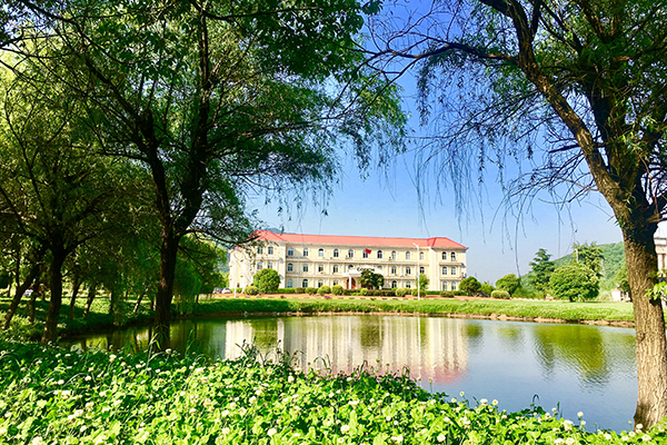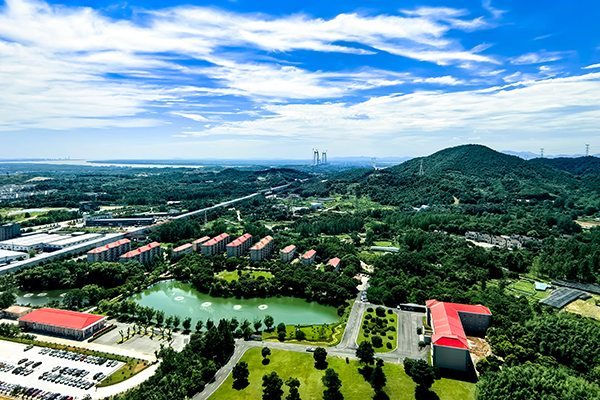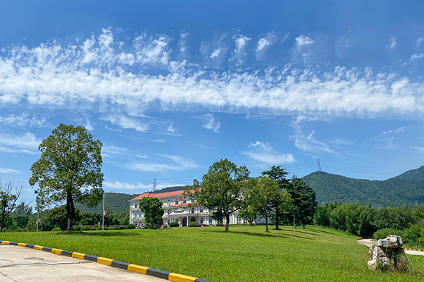 藍(lán)天白云下,蔥郁樹木錯(cuò)落點(diǎn)綴著如茵綠草,遠(yuǎn)處的辦公樓靜立其間,連綿青山為幕,勾勒出一幅明媚清新的自然景致。