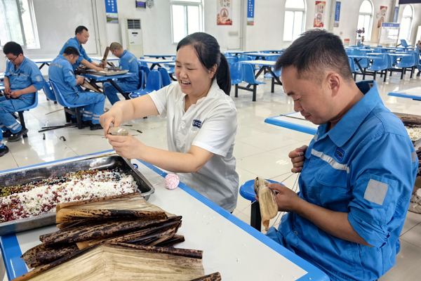 竹筍清香的粽葉、各式各樣的餡料整齊擺放,后勤組已為包粽子大賽提前做好了準備。活動伊始,主持人講解了本次“速度與質(zhì)量”挑戰(zhàn)賽規(guī)則,隨后參賽員工迅速投入“戰(zhàn)斗”,一雙雙巧手上下翻飛,將粽葉卷成漏斗狀,填入餡料,壓實、封口、捆綁,動作嫻熟流暢。不一會兒,形態(tài)各異的粽子就在大家手中誕生,有的棱角分明,緊實飽滿;有的小巧玲瓏,別具一格;有的圓潤飽滿,憨態(tài)可掬。雖然大家包粽子的技術(shù)參差不齊,但臉上都洋溢著開心的笑容,享受著收獲的樂趣。