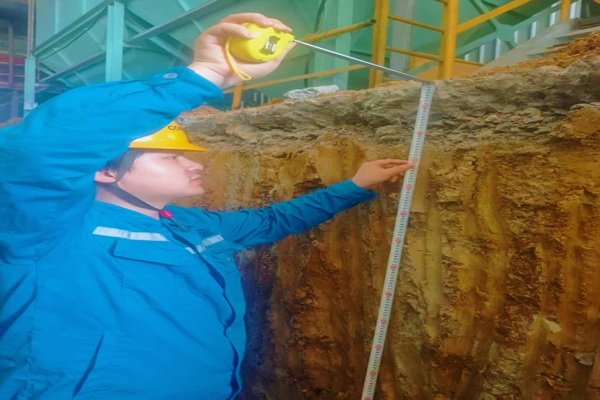 在水泥廠自動(dòng)裝車車道地基破除的周邊,“TA”用心測(cè)量著每個(gè)基礎(chǔ)鋼筋的距離,這處地基挖的孔洞明顯向南偏了20公分,那里的預(yù)埋件明顯傾斜不在水平面,“TA”指著孔洞以及前面水平儀上的刻度說(shuō),“現(xiàn)在不調(diào)整,等混凝土澆筑后地基不牢固或者偏移過(guò)大就是大問(wèn)題”。