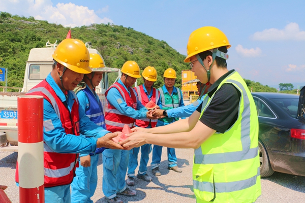 “大家辛苦了!一定要注意勞逸結(jié)合?!惫?/span>慰問組反復(fù)叮囑各班組長科學(xué)調(diào)配作業(yè)時(shí)間,礦山分廠爆破安全員熊師傅接過鹽汽水,臉上洋溢著笑容:“公司這么關(guān)心我們,這份清涼來得太及時(shí)了,我們一定加倍努力,保障生產(chǎn)安全高效!”