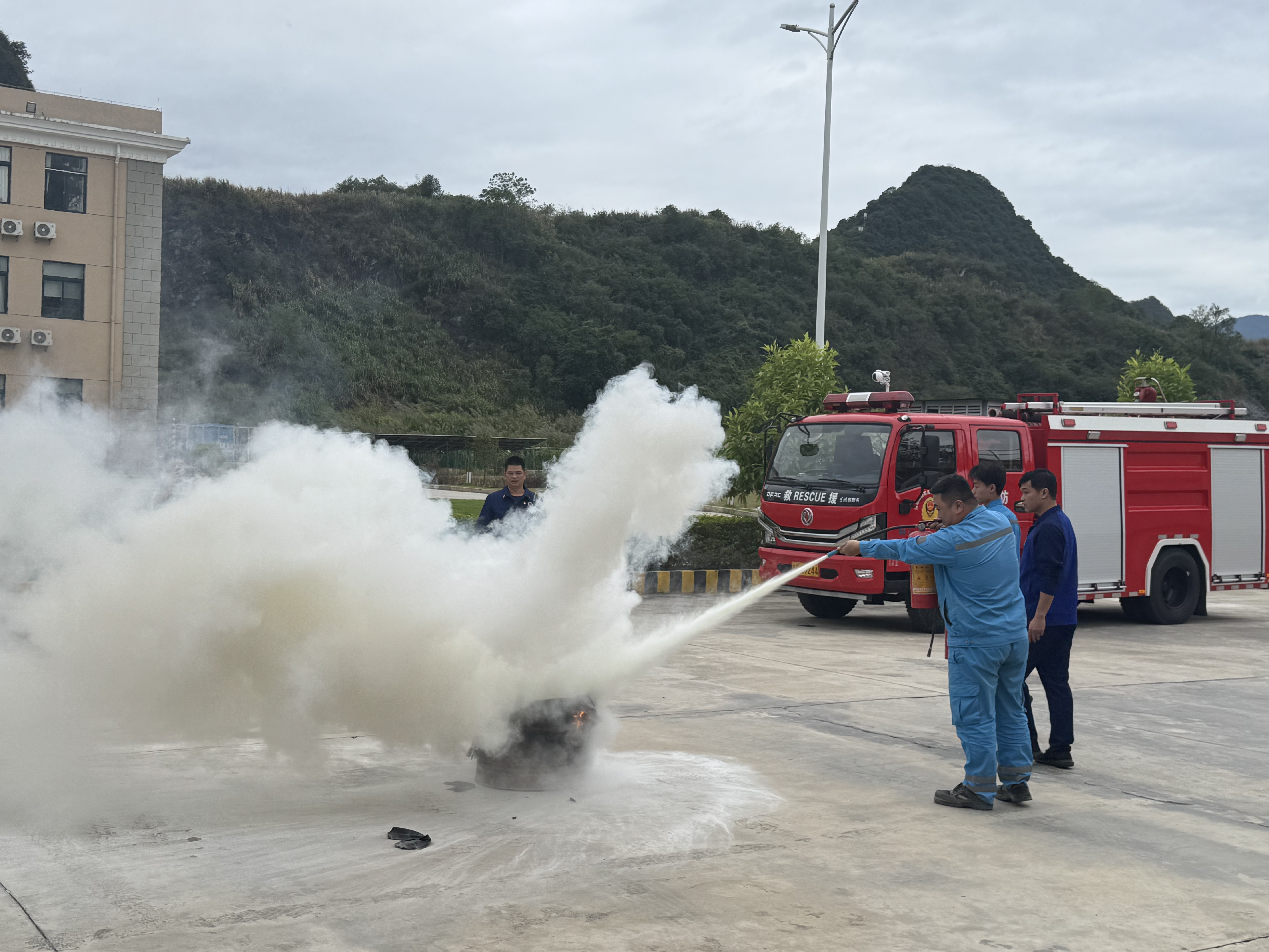 活動伊始,公司特別邀請本地消防部門的專業(yè)消防員開展專題培訓(xùn)。消防員結(jié)合水泥生產(chǎn)企業(yè)的作業(yè)特性與火災(zāi)風(fēng)險點,系統(tǒng)講解了各類常見消防設(shè)施的原理與使用規(guī)范,重點聚焦干粉滅火器、二氧化碳滅火器的適用場景、操作步驟及維護要點,確保知識傳遞貼合企業(yè)實際需求。培訓(xùn)采用“理論+實操”的沉浸式模式:課堂上,通過PPT演示、典型火災(zāi)案例剖析,直觀呈現(xiàn)滅火器構(gòu)造、火災(zāi)初期撲救技巧及逃生自救常識;大食堂前的實操場地,消防員打開紅色消防戰(zhàn)車的器材柜,逐一展示破拆工具、防護裝備的功能用途,手把手指導(dǎo)員工辨識器材特性,讓大家對消防安全形成更立體、深入的認知。