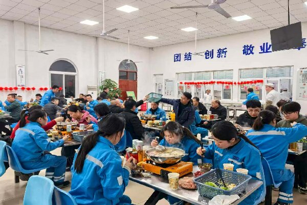 趣味競(jìng)賽結(jié)束后,暖胃暖心的特色小火鍋環(huán)節(jié)溫馨開(kāi)啟。鮮香濃郁的鍋底、琳瑯滿(mǎn)目的食材,讓員工們?cè)诤懈惺艿搅思业臏嘏c企業(yè)的關(guān)懷。大家圍坐一桌,舉杯暢談,分享著工作中的趣事與生活中的感悟,每位員工也依次分享了新年愿望,現(xiàn)場(chǎng)其樂(lè)融融,暖意濃濃。與此同時(shí),廠區(qū)內(nèi)早已換上了“新年盛裝”,紅燈籠、新年窗花等裝飾錯(cuò)落有致,處處洋溢著喜慶祥和的節(jié)日氛圍,讓每一位員工都能沉浸式感受元旦的喜悅。