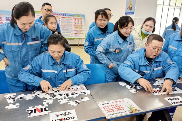 在本次迎新春活動(dòng)中,“拼出未來·新年‘拼’好運(yùn)”拼圖游戲以其獨(dú)特的設(shè)計(jì)和寓意深受喜愛。以海螺水泥標(biāo)識(shí)為核心視覺元素,巧妙融入春節(jié)傳統(tǒng)紋樣與吉祥符號(hào),既彰顯企業(yè)文化認(rèn)同,又傳遞出濃濃的年節(jié)氛圍。參與者凝神聚力、專注拼合每一塊圖塊,爭分奪秒呈現(xiàn)完整畫面。這一過程不僅考驗(yàn)參與者的觀察力與耐心,更通過視覺化的方式,深化了職工對(duì)企業(yè)品牌的感知與認(rèn)同,也寓意著每一位職工都是企業(yè)宏圖的一塊重要拼圖,共同拼出新年新氣象。