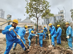 上午9點,植樹現(xiàn)場已是一派繁忙景象。公司各級管理人員帶頭示范,員工們分工協(xié)作、默契配合——揮鍬鏟土、扶樹填坑、踏土夯實、提水澆灌,形成“挖掘—搬運—定植”的高效流水線?!翱右谏钜恍烈葘?,水要澆透,這樣才能保證成活率。”經(jīng)驗豐富的老員工,手把手向年輕同事傳授植樹技巧。年輕員工邊學(xué)邊干,虛心請教,在老同志的指導(dǎo)下逐漸從生疏到熟練,一天內(nèi)就完成80余棵樟樹、橘子樹種栽任務(wù)。
